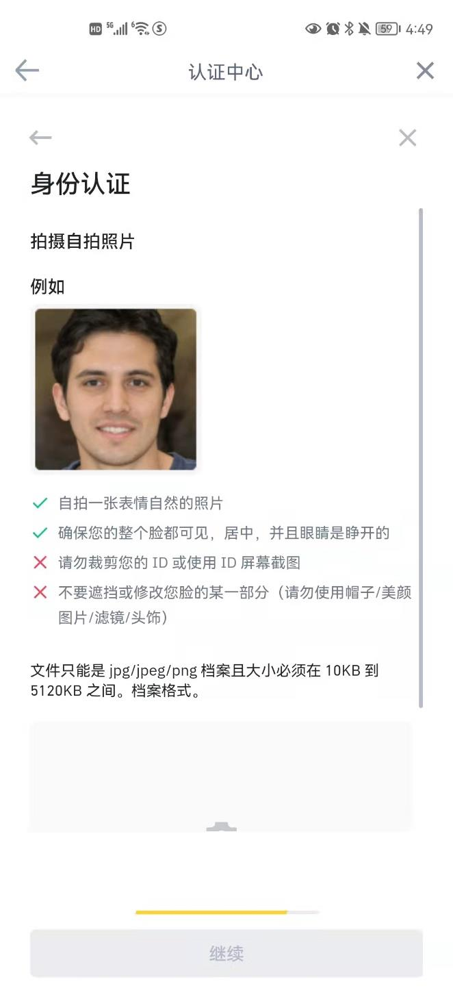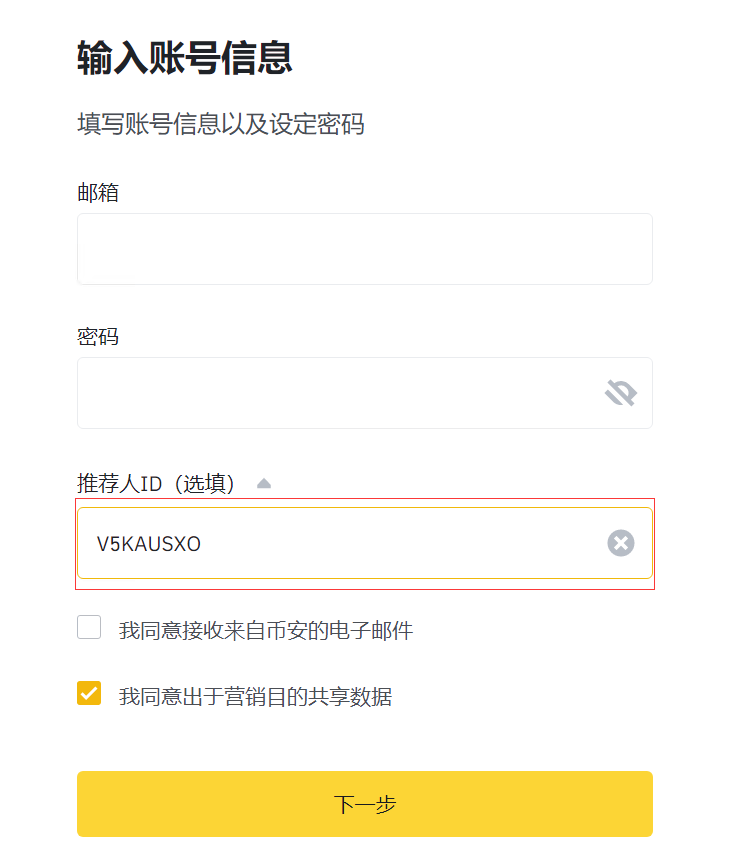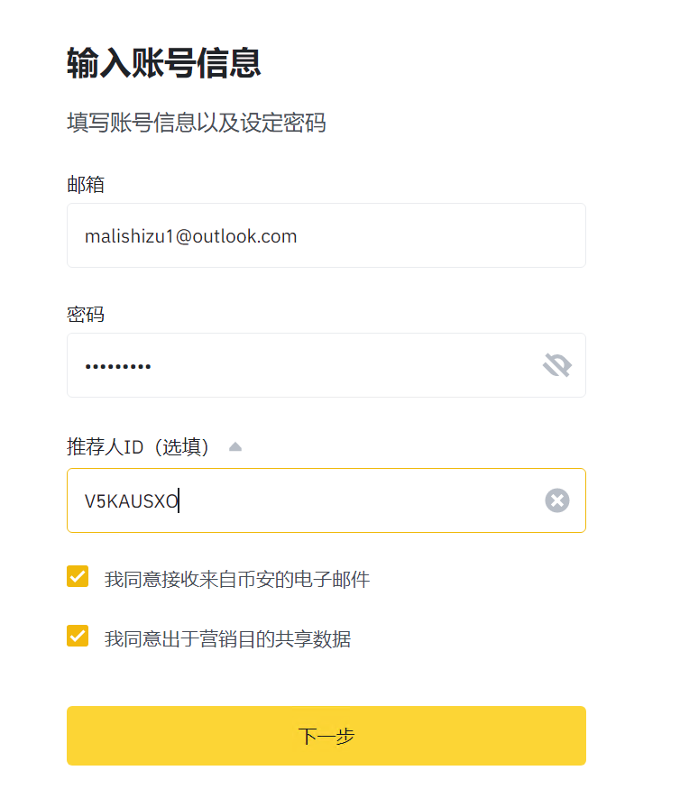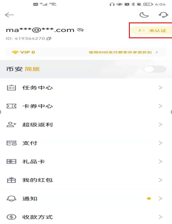 2.用电脑或手机注册币安账号 注册时填邀请码 V5KAUSXO,可获得返佣(如下图)。 1)在电脑上注册币安账号流程如下: 币安账号注册到实盘分为账号注册和实名认证两个环节,注册环节可以在手机和 电脑上进行,但是都需要科学上网。实名认证环节建议在手机上进行,目前不需 要科学上网。 ① 币安注册网址:https://www.binance.com/zh-CN,点击网址即可进入注册页面。 ② 居住地选择的是香港,不要写中国。 ② 选择邮箱注册,建议使用前文申请的 Outlook 邮箱注册。 ③ 点击下一步,找到邮箱收件箱中验证码,在注册页面输入。 ④ 绑定手机号,此处可用中国号码所属的+86。 ⑤ 获取手机验证码,点击提交。 ⑥ 完成以上操作就算完成注册了。 2)币安验证 ① 注册完成后用手机认证,认证上传照片比较方便。 ② 登录币安 app 后,点击左上方小人图像 ③ 如下图右上角显示未认证。 ④点击未认证图标,居住国家选择香港。然后点击立即开始。 ⑤选择国籍为中国,姓名/姓氏/出生日期填写真实信息,填写后进行下一步。 ⑥ 合法居住地址与城市可任意填写。 ⑦ 身份认证信息:证件签发国选择中国,点击继续。 ⑧上传正反面身份证照片。如果遇到提交资料不通过,在客服聊天界面找人工, 要求人工审核,就可以立马通过。 ⑨拍摄一张自拍照 ⑩根据语音提示通过人脸验证。 点击开始验证后,返回开头页面,就会看到认证中的提示。一般等待一段时间后 就会变为已认证,即认证成功。